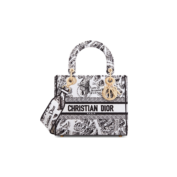 Dior Medium Lady D-Lite Bag White And Black Plan De Paris Embroidery